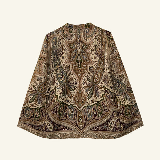 Lightweight and feminine, this ladies jacket in soft blush brown features delicate white threadwork. It’s perfect for warm days or cool evenings and pairs well with wide-leg trousers or dresses. A comfortable and trendy in boho style outerwear.